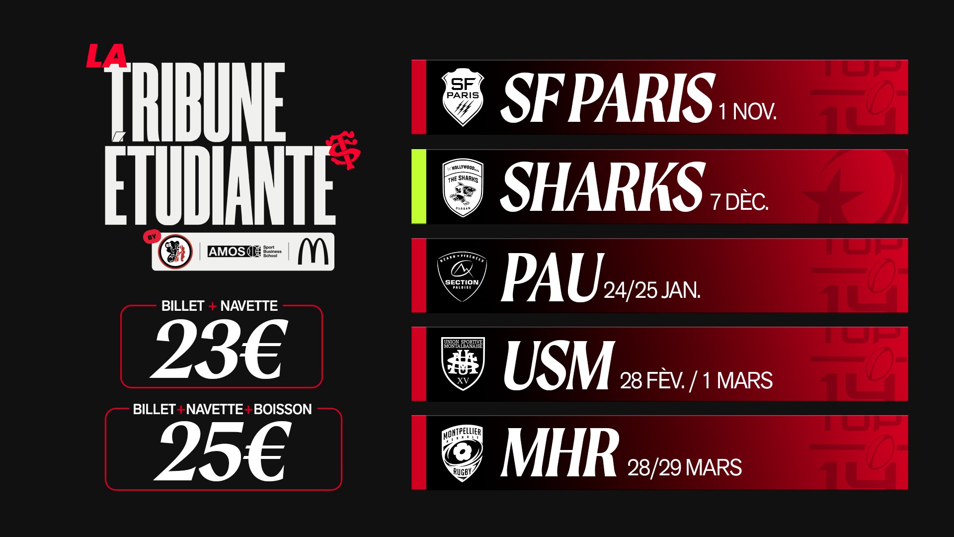 Le bar Chez Tonton, l'école AMOS et Mcdo s'associent avec le Stade Toulousain pour créer une tribune étudiante et une offre exceptionnelle.