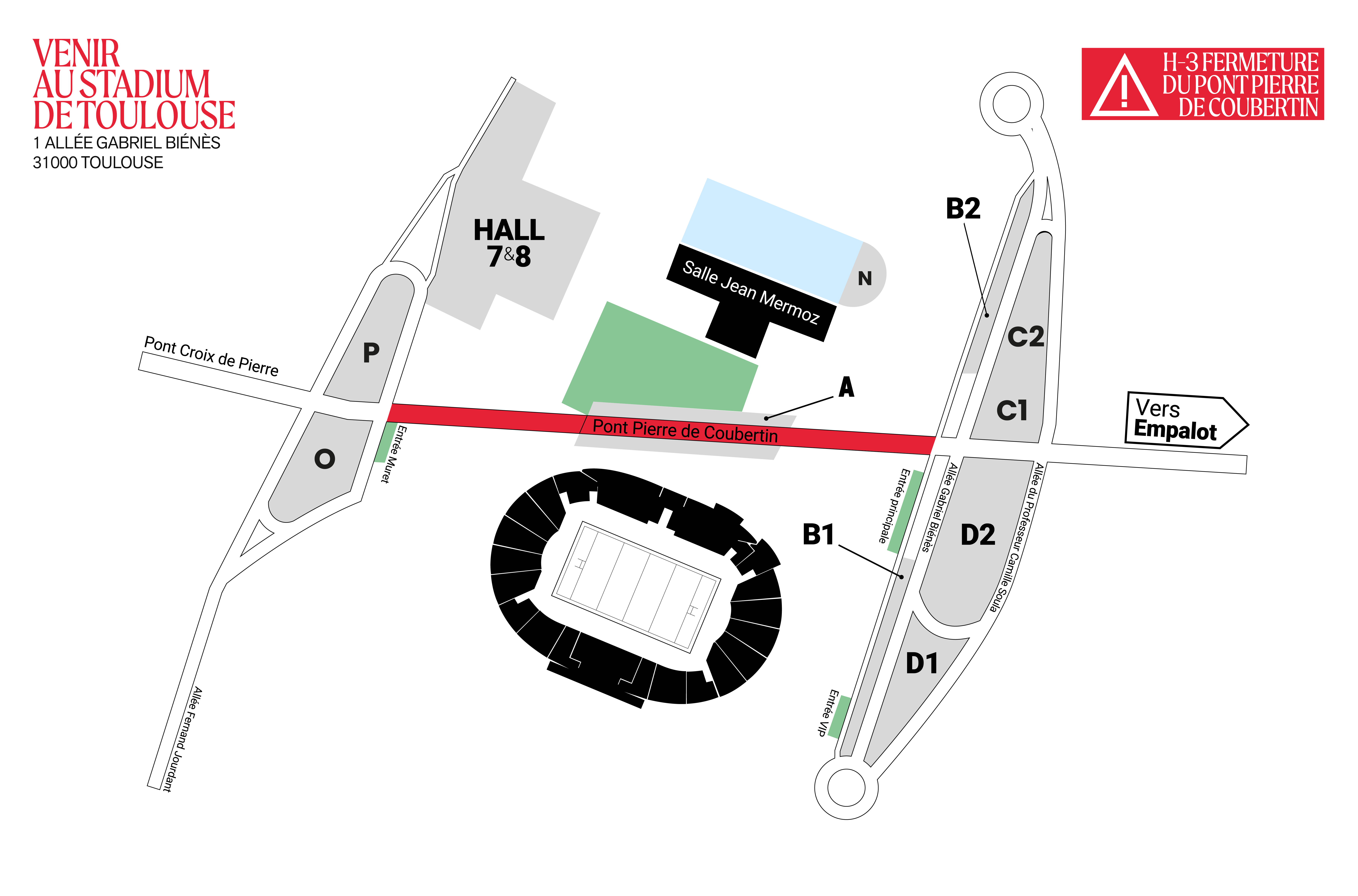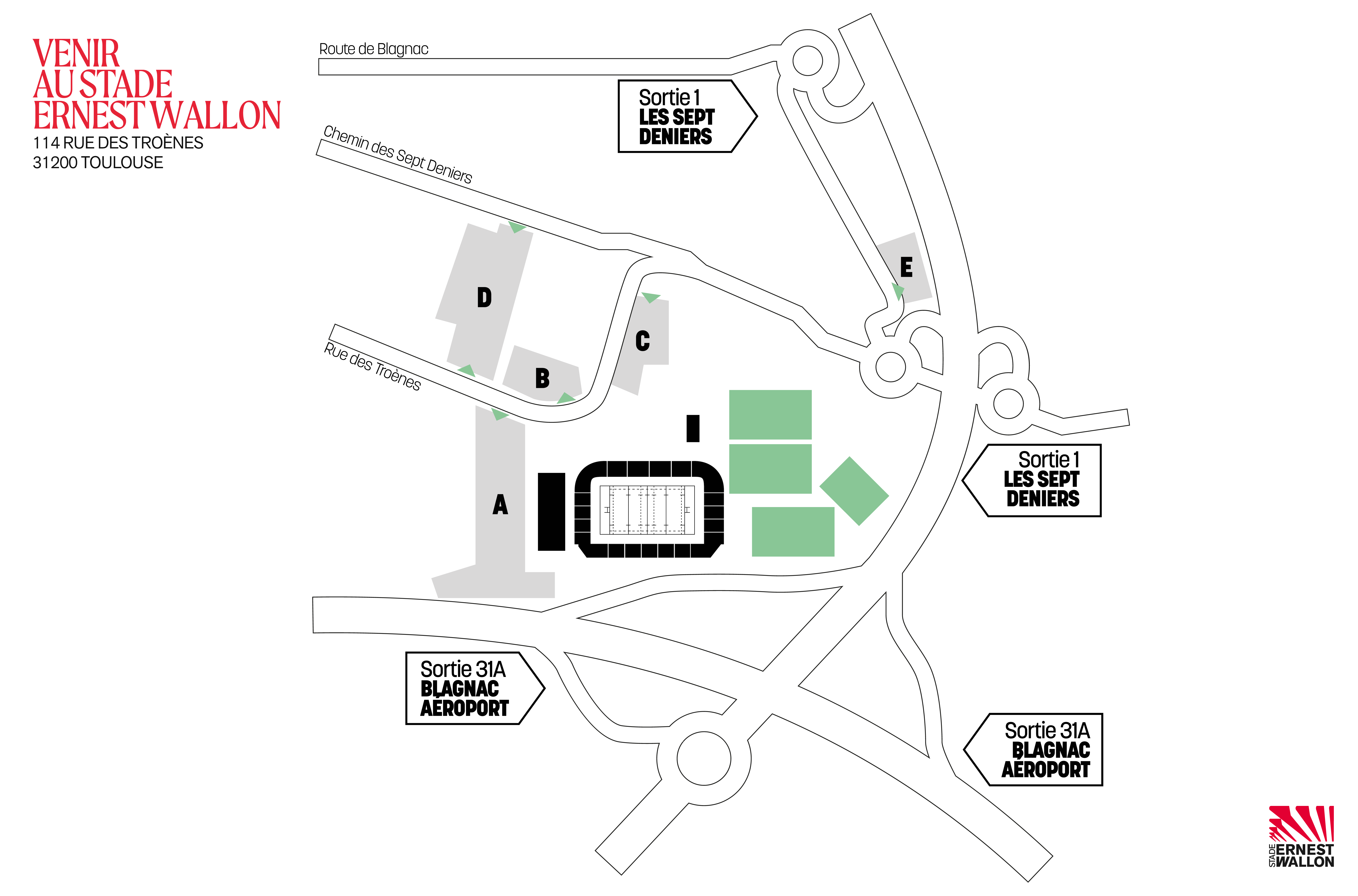 Le nombre de place de parkings étant limités, nous vous encourageons, si vous le pouvez, à utiliser le service MOBIBUS mis en place par Tisséo. Réservez votre trajet sur l'application Mobibus Toulouse ou via le lien suivant : https://www.tisseomobibus.com/ , vous pourrez vous faire récupérer à votre domicile et déposer directement au stade Ernest-Wallon ou au Stadium de Toulouse.